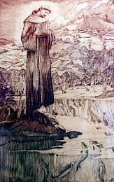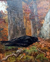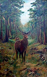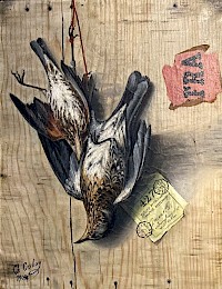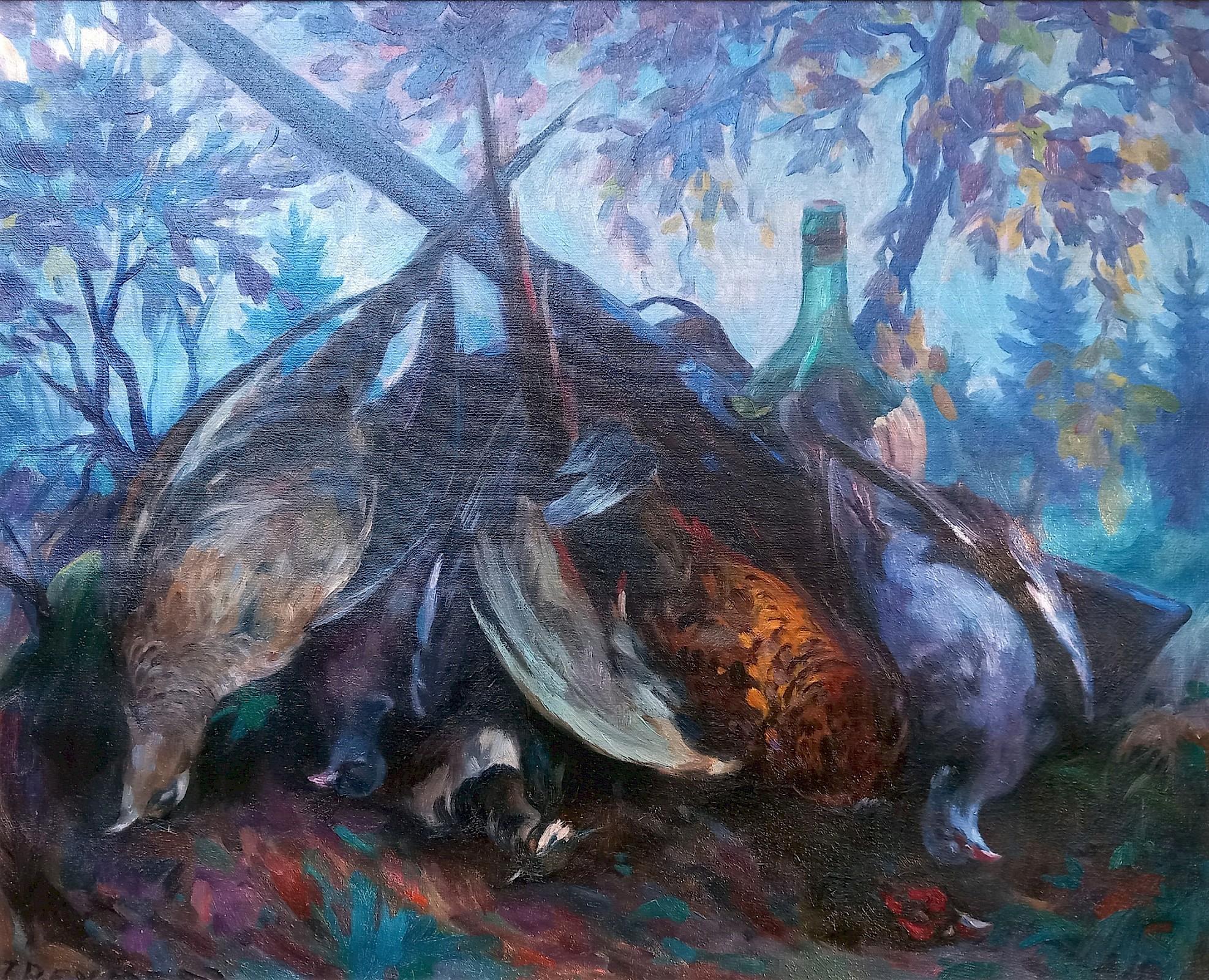 En premier plan, on perçoit la récolte d’une belle journée de chasse en solitaire. Deux ramiers, un vanneau ainsi qu’un couple de faisans de Colchide la compose. Cette œuvre transpire la profonde liberté de la solitude et le bien-être attenant. Le halo bleu manifeste cette paix intérieure, il s’apparente à la rêverie.